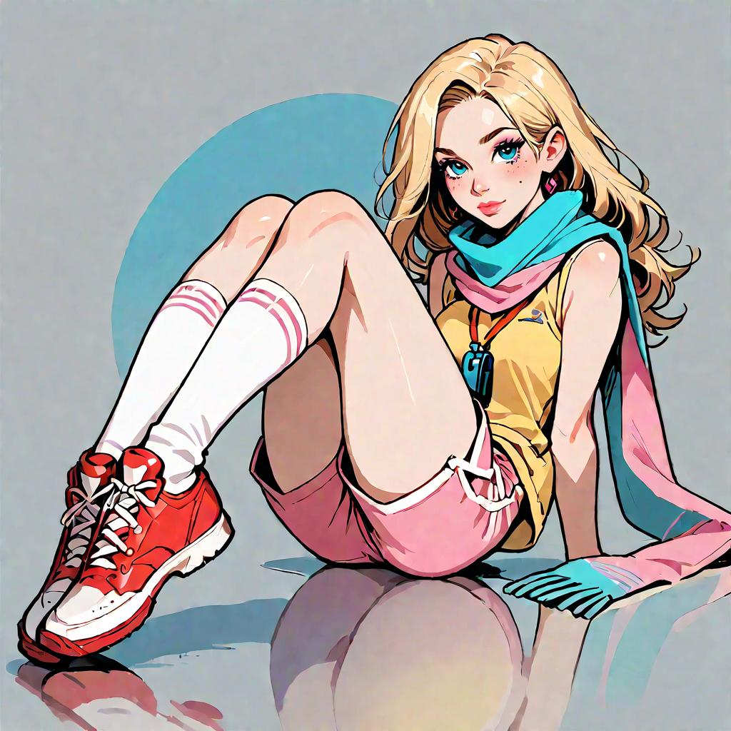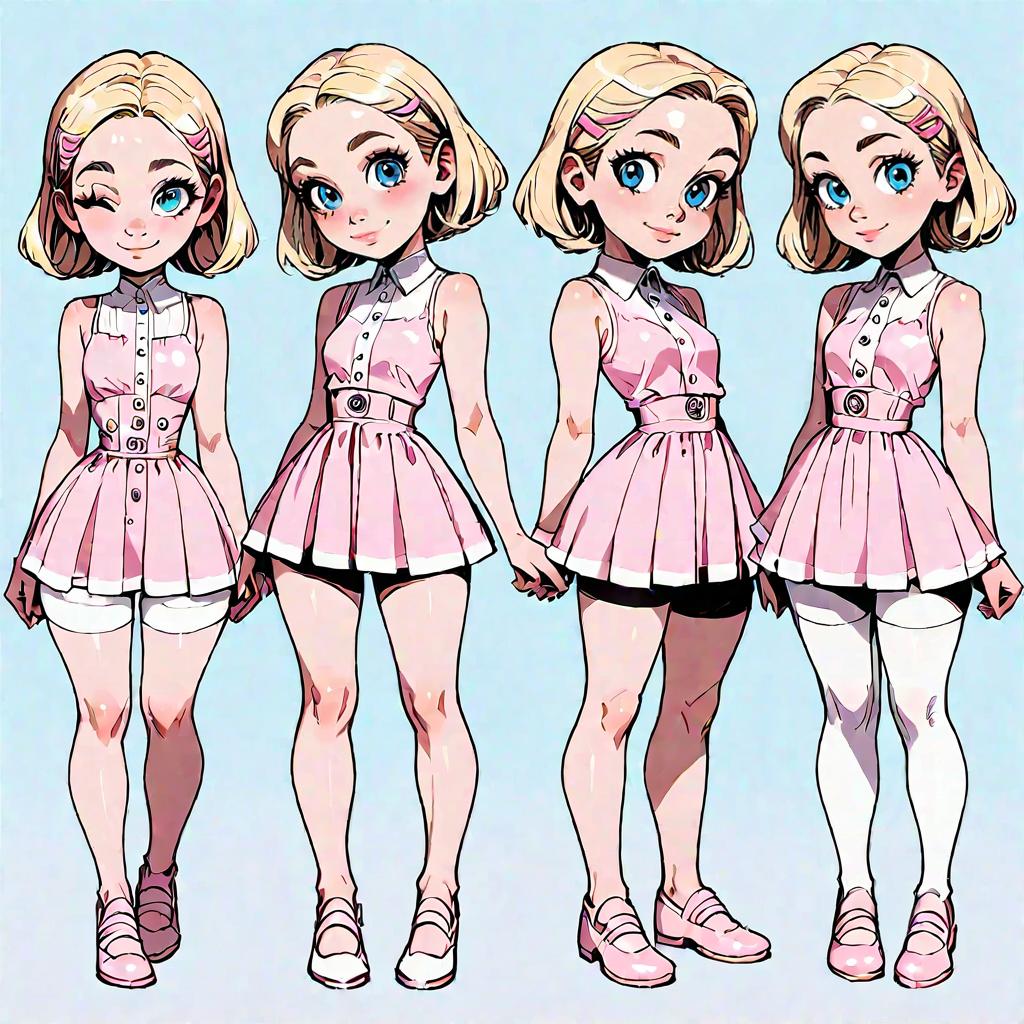 Anime style digital illustration featuring a blonde girl with short hair wearing a sleeveless pink dress with a belted waist. She has large blue eyes, is shown in four different poses including winking and smiling, and wears various legwear including white thigh highs and shorts. The character design emphasizes cute, youthful features with a soft color palette and expressive facial expressions.