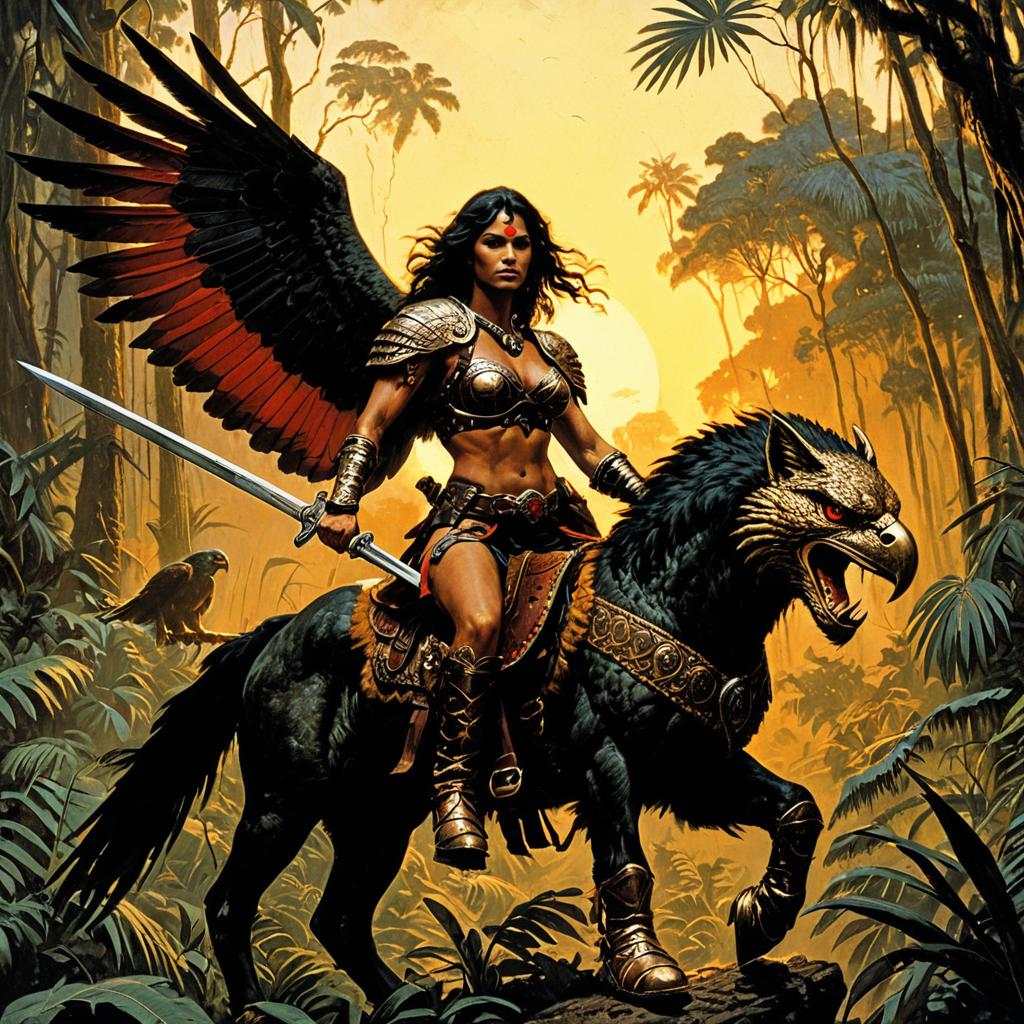 Famous artwork inspired by Frank Frazetta, heroic fantasy, gritty, exotic, beautiful amazon warrior, riding on a red hawk, with keen scarlet eyes, in a dense primeval jungle, soft golden sunset, engraved bronze cuirass, boots, bracers.