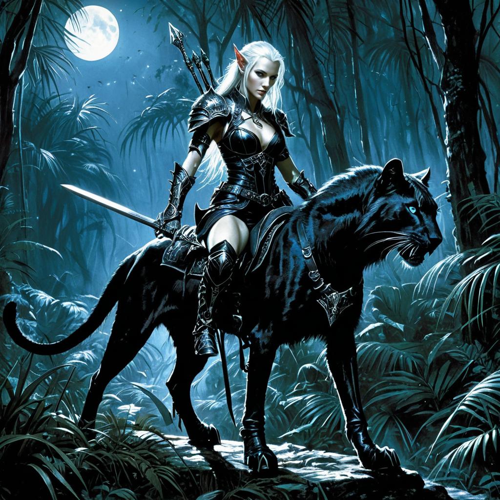 Heroic fantasy artwork featuring a fierce Amazon warrior with dark skin and long dark hair, wearing engraved bronze armor including a cuirass, boots, and bracers. She holds a sword and rides a mythical black beast with a wolf's body and a hawk-like head with scarlet eyes. The dense primeval jungle is illuminated by a soft golden sunset, enhancing the exotic and gritty atmosphere.