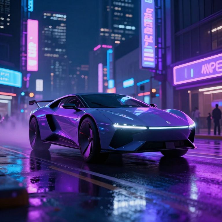 Neon-lit city night scene: sleek, futuristic silver sports car with glowing headlights driving on wet street, surrounded by vibrant purple and blue neon signs