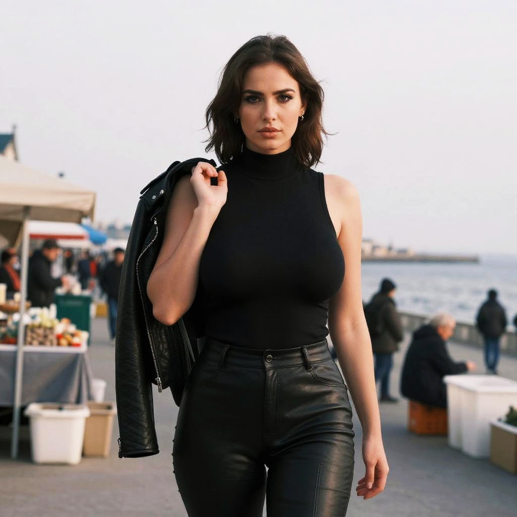 A Pear-shaped body type woman, edgy in a black sleeveless turtleneck and fitted leather pants, with a biker jacket draped over one shoulder, captured in a kodacolor analog film style at a seafront promenade with market vendors. Sexy. Pretty face and beаutiful eyes. Big breasts