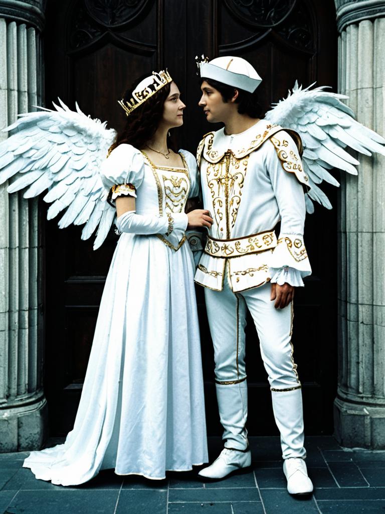 Couple in Romeo and Juliet Angel Costumes, full-body cosplay photo with wings