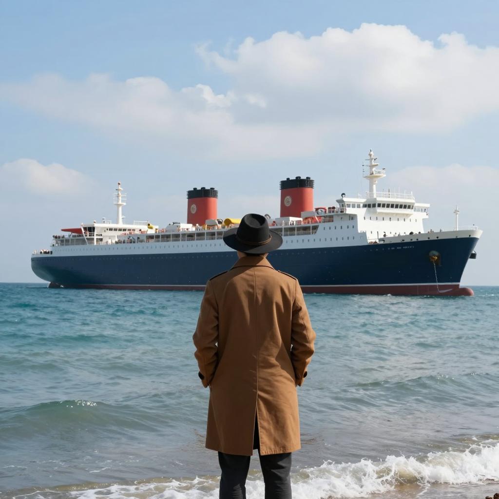 A man in a long brown coat and black hat stands in shallow ocean water, facing a large dark blue ocean liner with two red smokestacks. The sky is bright blue with white clouds. The man's back is to the viewer. The ocean is turquoise. The liner is centered in the background. The man stands in the foreground, alone.