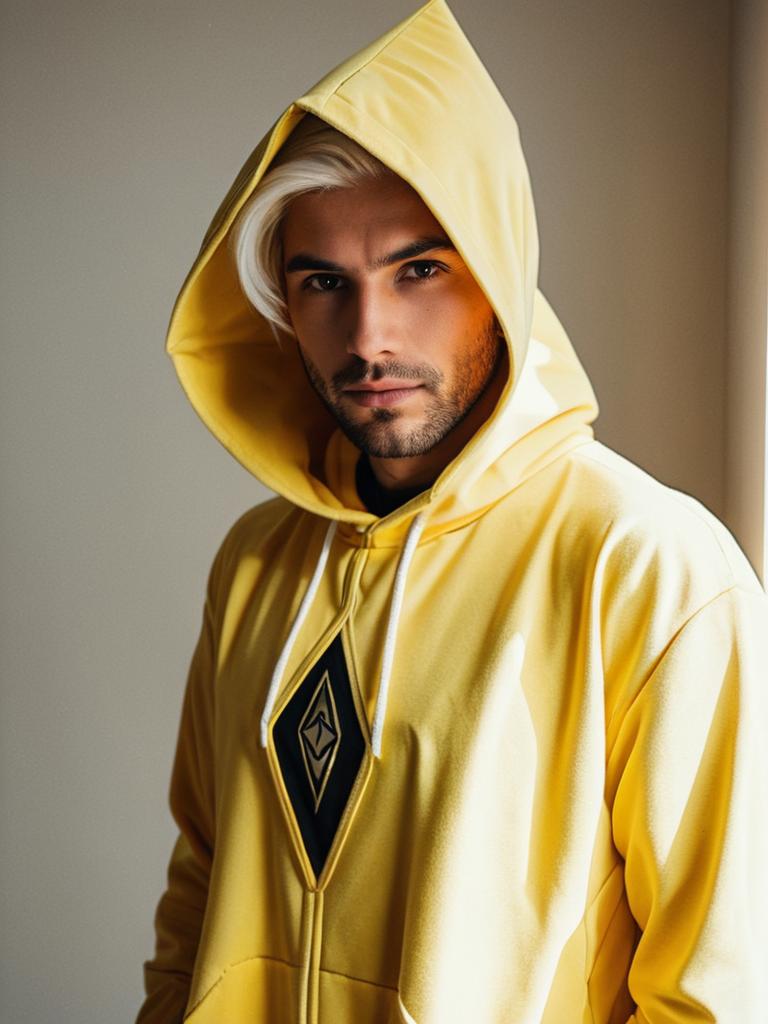 Portrait of a young man wearing a yellow hoodie inspired by Yellow Diamond cosplay. He has platinum blonde hair, a trimmed beard, and a focused expression. The hoodie features a black and yellow diamond emblem on the chest and white drawstrings. The background is neutral and softly lit.