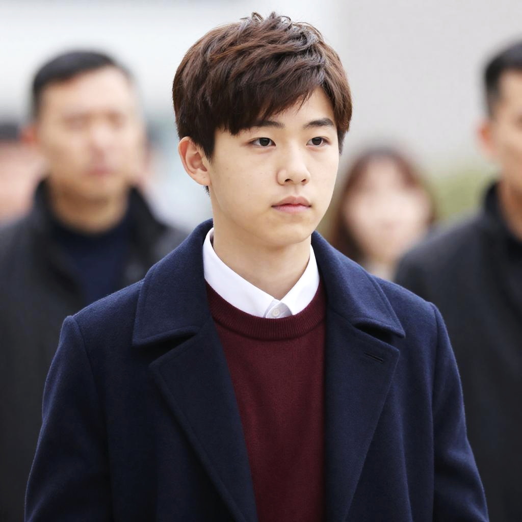 Young man with short brown hair, light skin, wearing a dark blue coat over a maroon sweater with a white collared shirt. Background blurred with indistinct figures. He looks slightly to the right with a neutral expression. Bright light from the front.