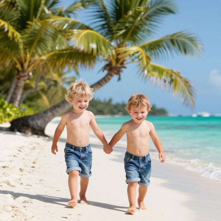 Two joyful toddler boys, shirtless and wearing rolled-up denim shorts, laugh and hold hands as they playfully walk along a sunlit tropical beach, surrounded by lush palm trees and crystal-clear turquoise waters.
