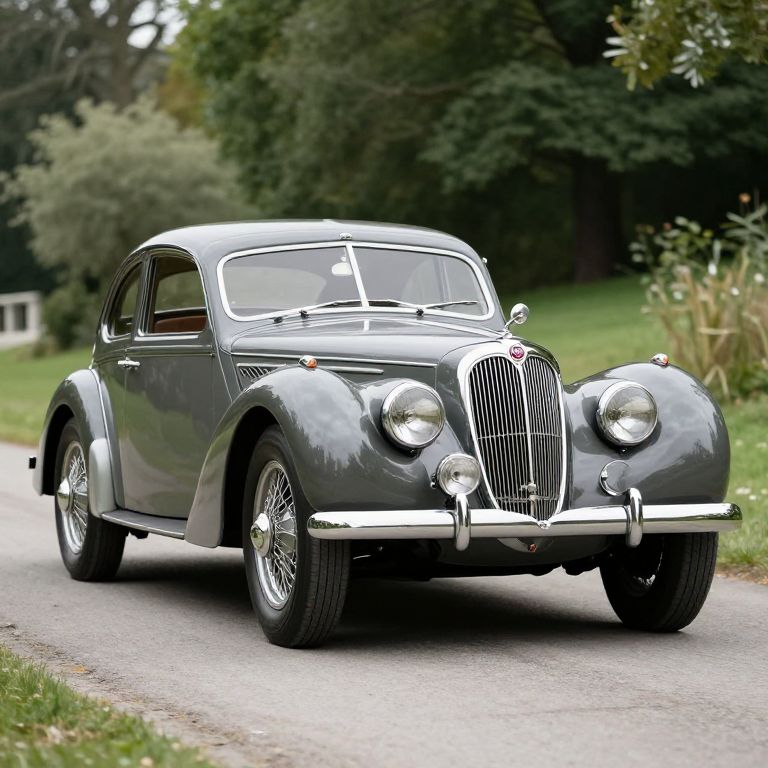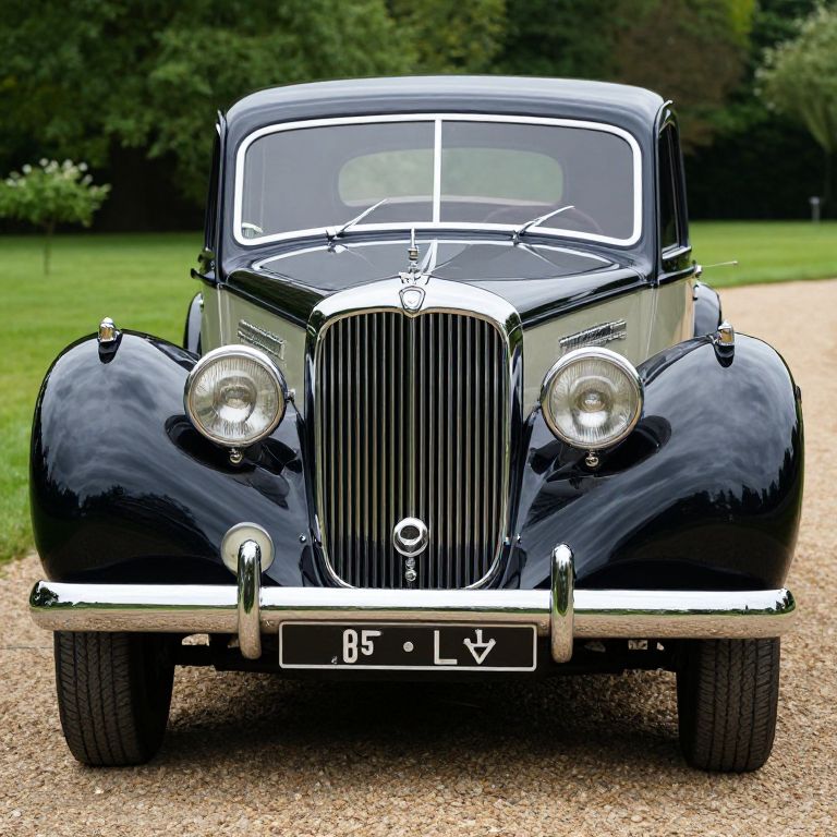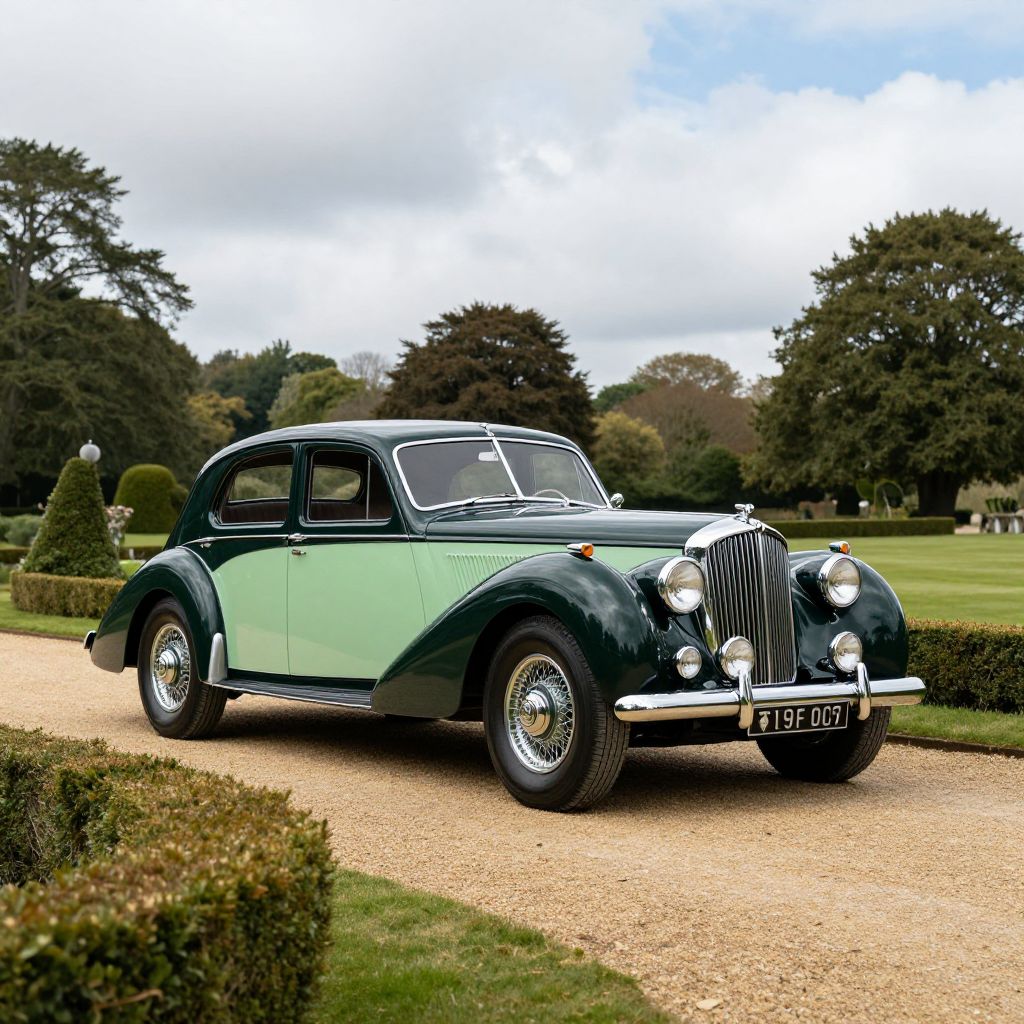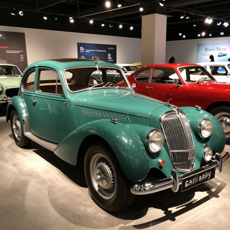 Photograph of a vintage, teal classic car with chrome details, round headlights, and "CH11 HMP" license plate, displayed in an indoor