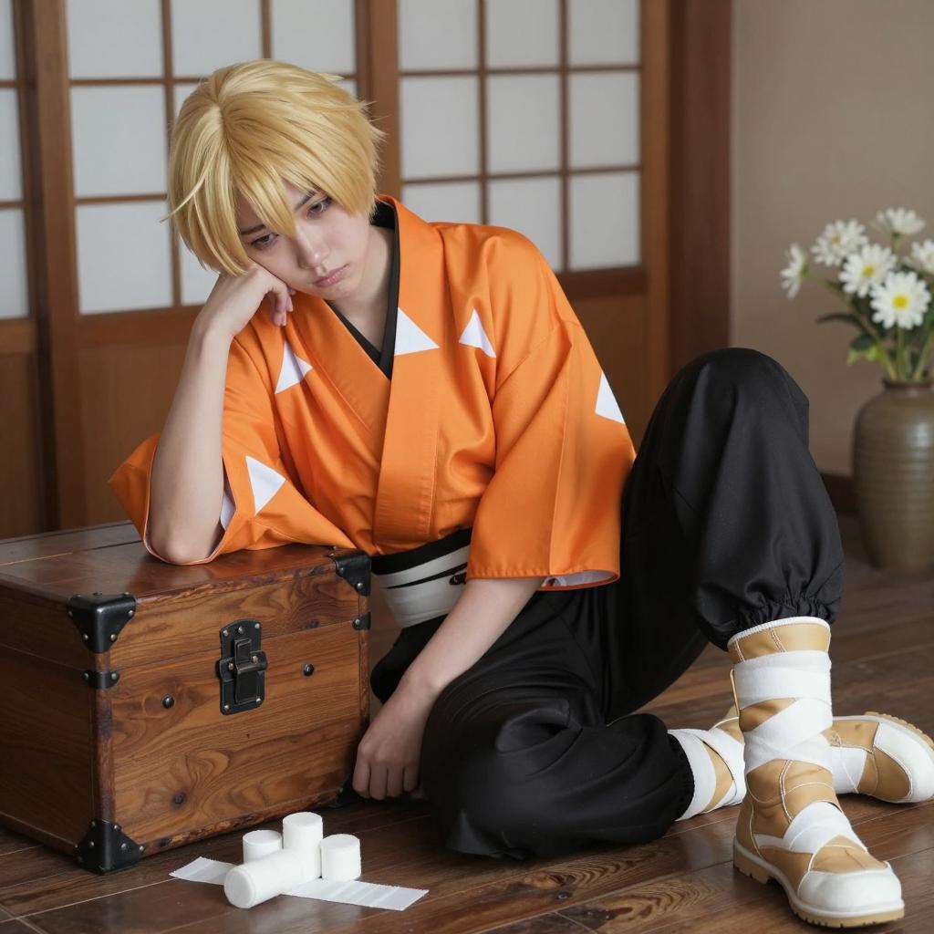 Full-body portrait of a cosplayer wearing a dark maroon kimono with orange and yellow flame patterns on the sleeves and hem, paired with a white sash. The individual has blond hair with orange tips and is wearing a white protective face mask. They stand in a leafy garden with a tree featuring red and green leaves in the background, holding a sword in their left hand and raising their right arm. The cosplayer is dressed in red and yellow shoes, under soft, overcast natural lighting.