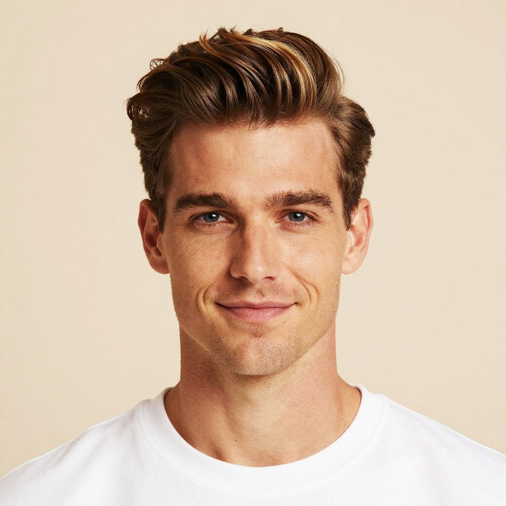Artistic studio portrait of Seitenscheitel Mann with perfectly styled side part, subtle smile, clean background in pastel colors, soft-focus lighting emphasizing texture and details, contemporary fashion aesthetic