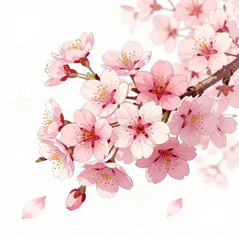 Digital illustration of a cherry blossom branch with delicate pink flowers, yellow stamens, and a few unopened buds against a white background.