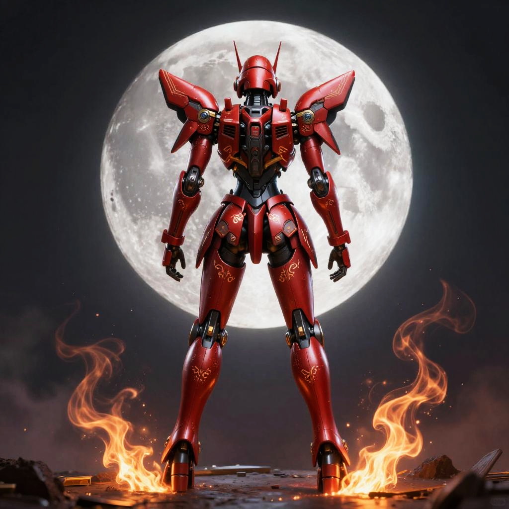 Digital artwork of a red, humanoid robot standing in a dramatic, nighttime scene with a large, bright full moon in the background. The robot has an imposing stance with glowing red eyes, intricate armor details, and flame-like elements at its feet. The dark sky contrasts sharply with the bright moon, emphasizing the robot's silhouette. The ground is rocky and partially engulfed in flames, adding to the intense, almost apocalyptic atmosphere. The robot's design features sharp, angular lines and a metallic texture, giving it a powerful, futuristic appearance.