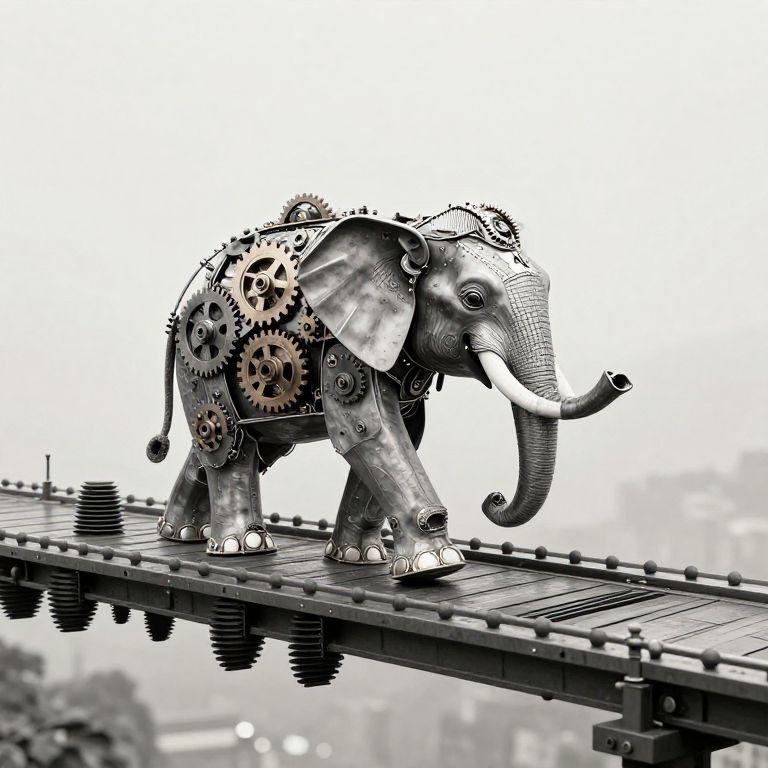 A clockwork elephant with gears for eyes marches through a cityscape composed entirely of folded paper, leaving ripples in time.