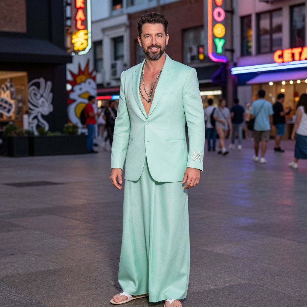 A trendy man in his 40s with a beard, deep blue eyes, and a friendly smile wearing a modern palazzo suit in mint green as a fashion-forward costume, taking a photo in a neon-lit urban plaza with a mix of street art and retro signage, the suit standing out against the vibrant city backdrop with a subtle movement in the fabric from the breeze.