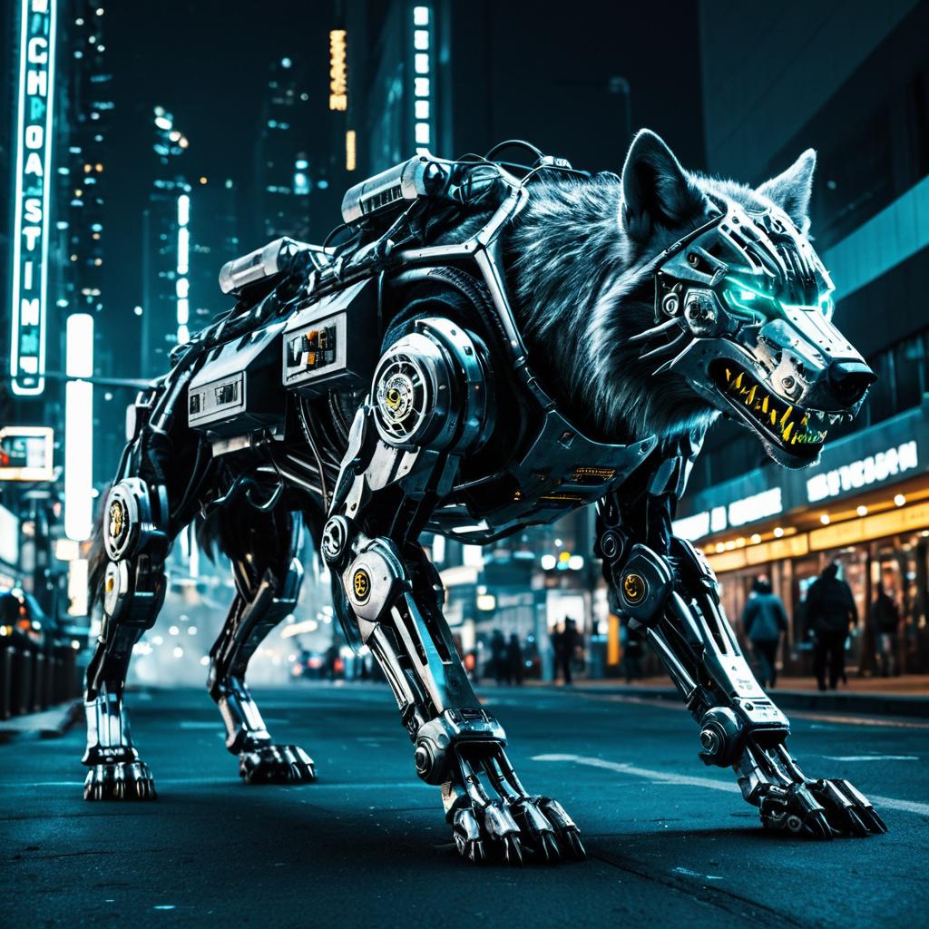 Ultra-detailed cybernetic wolf prowling stealthily on a city street at night, featuring a chrome-plated exoskeleton with mechanical limbs and glowing neon blue eyes. The futuristic sci-fi scene is illuminated by vibrant neon lights and signs, highlighting the advanced technology integrated into the wolf's design.
