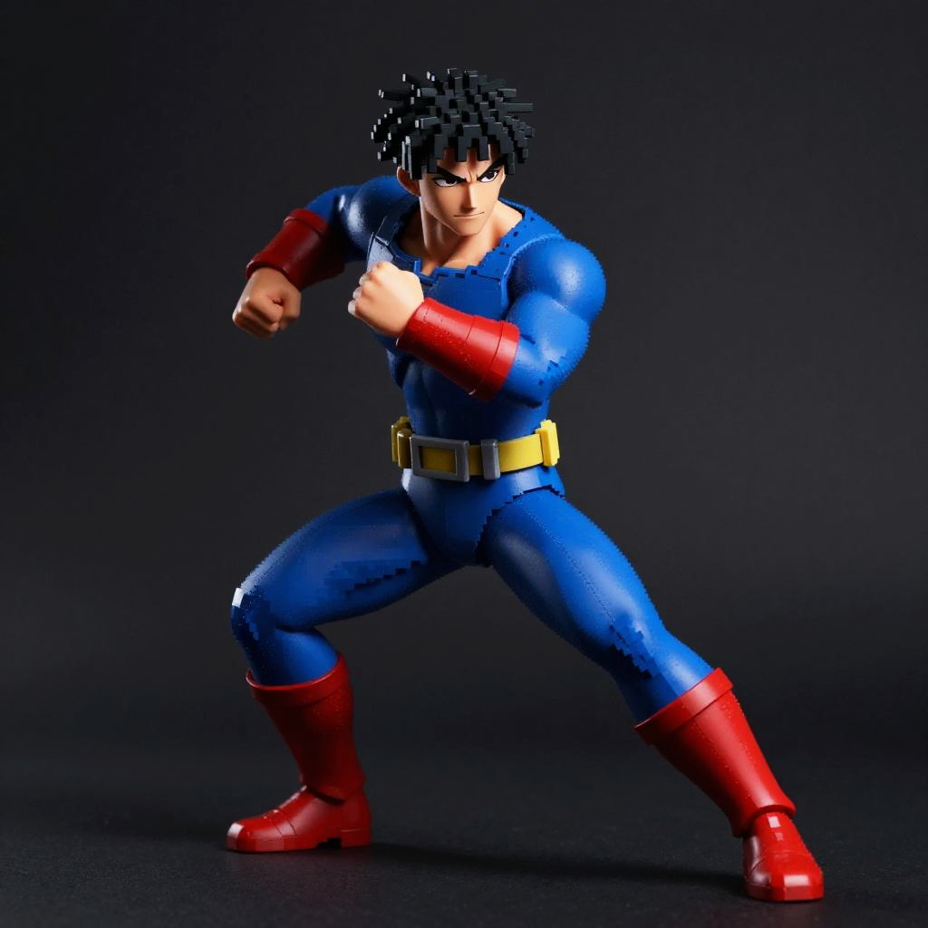 Realistic photo.High-quality image of a pixel-art-inspired anime superhero, shot with Canon EOS R6, dynamic pose, dramatic lighting with shadows and highlights, dark background creating depth and intrigue realistic photo