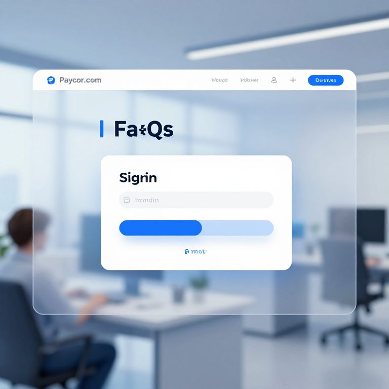 Www.paycor.com/faqs/signin portal interface, sleek modern web design with translucent panels and soft blue hues, user-friendly layout with clear navigation, futuristic digital workspace environment, high resolution, sharp focus