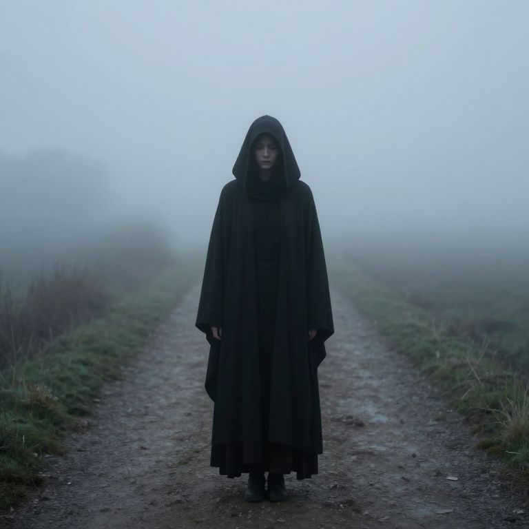 Photograph of a mysterious figure standing on a foggy, dirt path. The person is dressed in an oversized, black hooded cloak that covers their entire body, with only their face partially visible. The cloak's hood is drawn up, casting shadows over their face, making their expression unreadable. The background is completely enveloped in thick, white fog, obscuring any distant features. The path is flanked by grassy fields on either side, which are barely visible through the mist. The overall color palette is muted and dark, dominated by blacks and grays, creating a haunting, eerie atmosphere.
