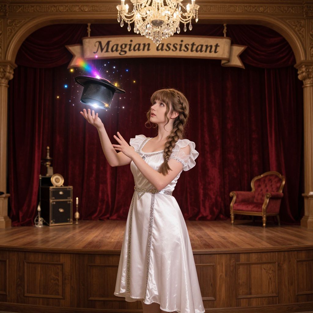 A graceful, fair-skinned woman with long braided hair and a soft gaze stands in the center of a classic magic theater with a grand wooden stage and crystal chandeliers. She wears a vintage-style magician's assistant costume with glittery trim and a flowing white dress that catches the light. As she performs, a rainbow-colored sparkles appear around her, creating a dreamy illusion of a floating hat vanishing into thin air. The backdrop features vintage magic props and a red velvet curtain with a subtle 'Magician assistant' engraved banner. The keyword 'Magician assistant' is integrated naturally into the setting and character.. The woman has big tits and cute face
