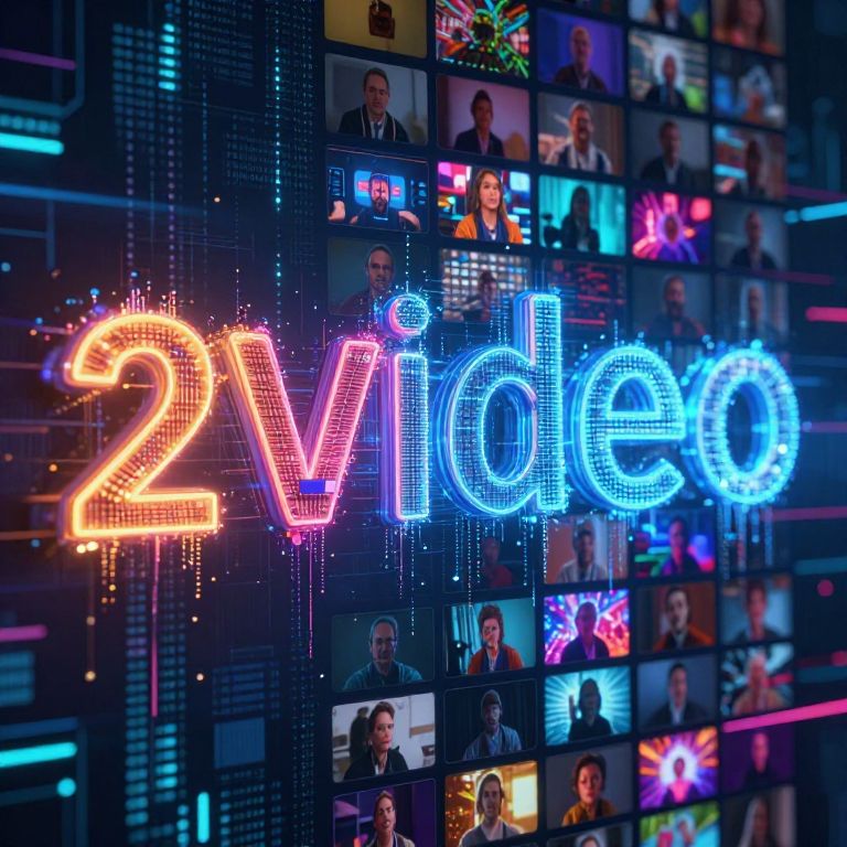 Photograph of a neon-lit grid wall displaying "2 Video" in colorful LED lights, with multiple smaller video screens showing various people in suits.