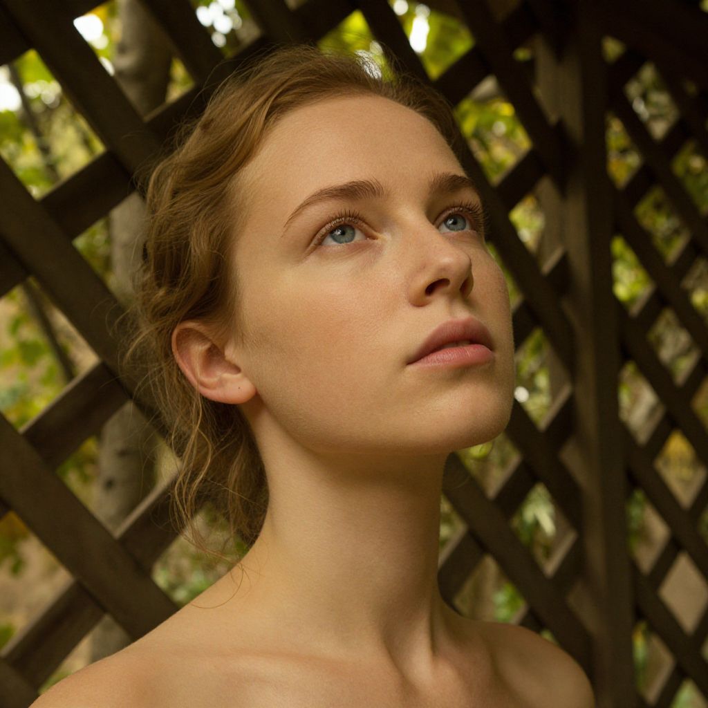 A captivating portrait photograph captures the essence of a European woman with porcelain skin and piercing blue eyes, her expression a study in serenity tinged with contemplation. Illuminated by soft golden light filtering through an ancient wooden lattice fence, she appears lost in thought, her gaze fixed on some distant point. The low angle perspective enhances the lush greenery behind her, creating an ultra-realistic image that evokes introspection and a deep connection with nature, drawing viewers into the untold stories lurking within her soulful eyes.