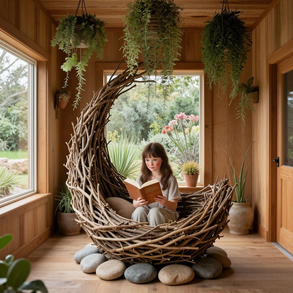 A nature-inspired interior design room with warm wood walls, hanging greenery, and a large central sculpture made of woven branches and stones, showing a woman with soft red cheeks and kind eyes sitting by a window overlooking a garden with native plants, reading a book with earth-toned cover