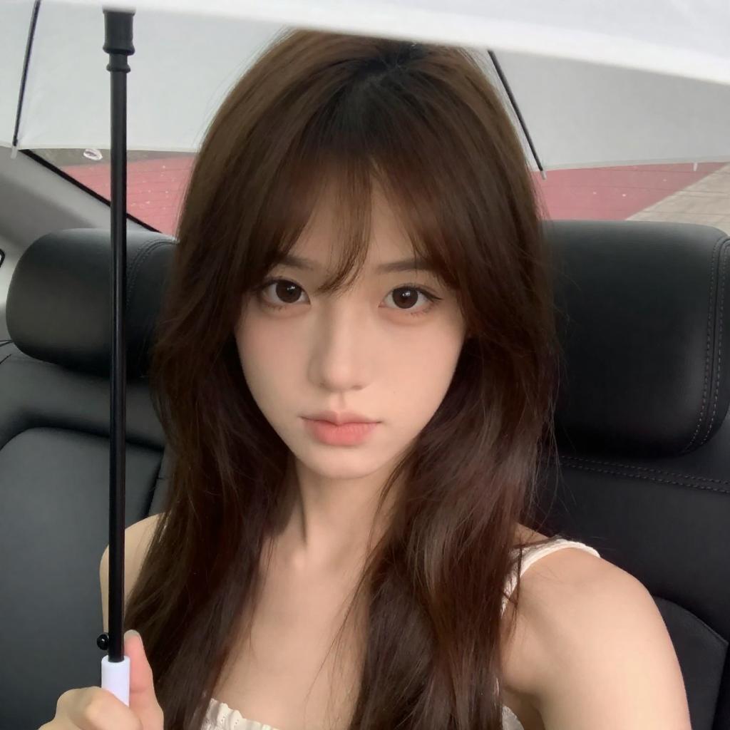 Photograph of a young woman with fair skin and brown hair with bangs, sitting in a car. She has large brown eyes and a neutral expression. She holds a white umbrella in her right hand, partially obscuring her face. The car's black headrest is visible behind her, and a red, speckled background is seen through the car window.