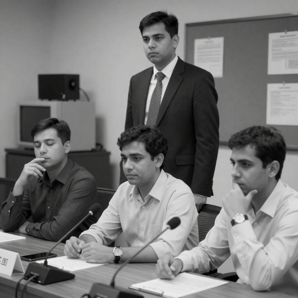 Photograph of two men sitting side by side. The man on the left has dark hair, a mustache, wearing a plaid jacket over a blue shirt. The man on the right has gray hair, a heavier build, wearing a beige coat over a red shirt. Both men look to the left with neutral expressions. Background features beige curtains.