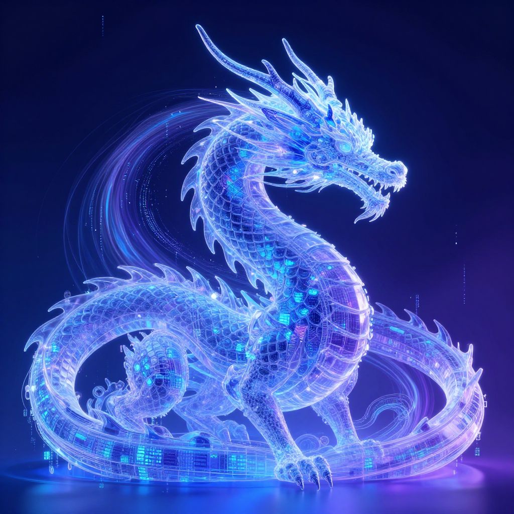 AI dragon generator visualization, majestic dragon formed from flowing data and pixel elements, semi-transparent digital scales, electric blue and purple hues, surreal fusion of fantasy and artificial intelligence, fantasy art meets cybernetic design