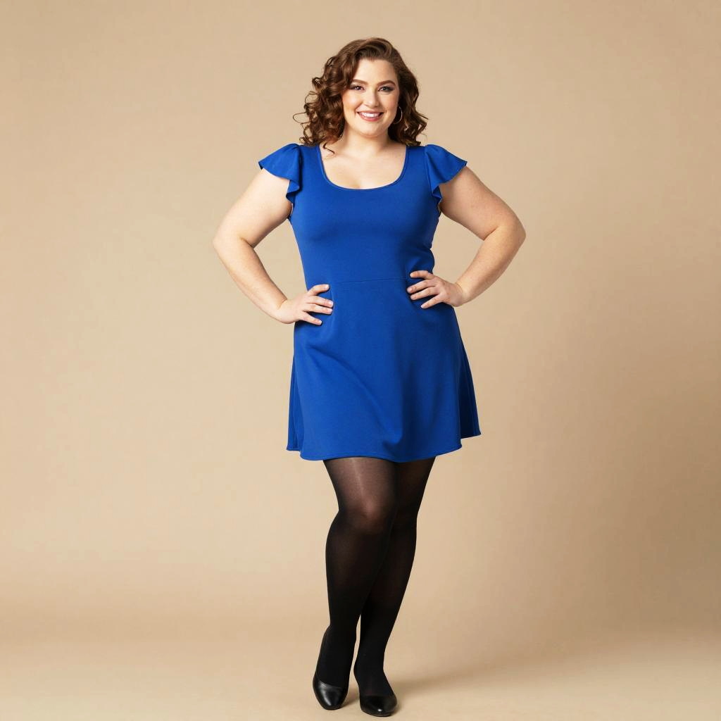 Plus Size Bluey, a woman in a blue dress and black tights posing for a picture