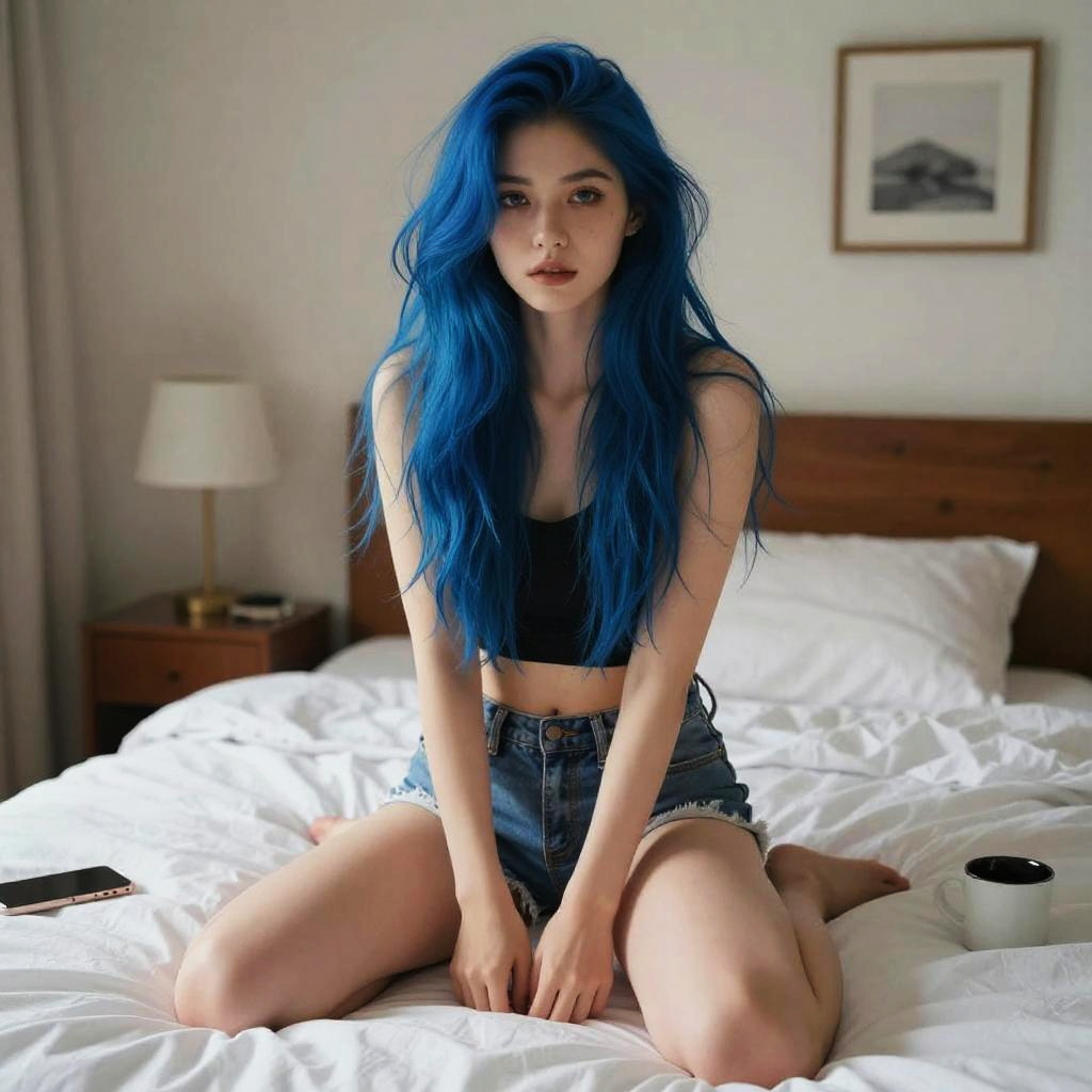 Beautiful girl in messy bedroom, full body, pofy hair, (realistic face, perfect eyes, perfect face:1.1), blue hair