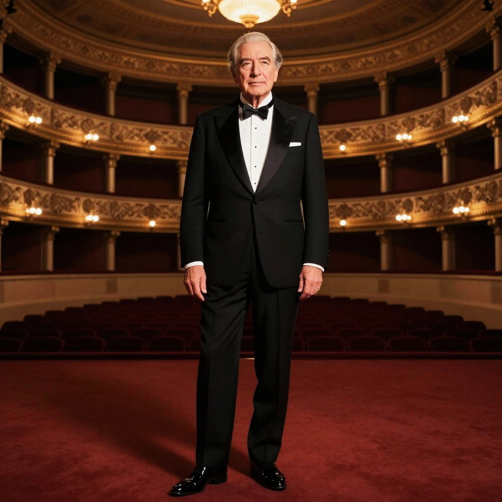 Realistic photo.Full-length depiction of an older man in a classic tuxedo, standing in a grand theater, with striking elegance, evoking Harper's Bazaar's signature editorial quality. realistic photo