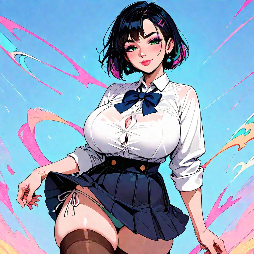Score_9, score_8_up, score_7_up, score_6_up, score_5_up, score_4_up, (source_anime), 1girl, solo, long hair, breasts, looking at viewer, smile, open mouth, blue eyes, skirt, blonde hair, shirt, thighhighs, twintails, very long hair, school uniform, thighs, pleated skirt, fang, huge breasts, white thighhighs, blue skirt, skindentation, thick thighs, tented shirt, colored eyelashes, school