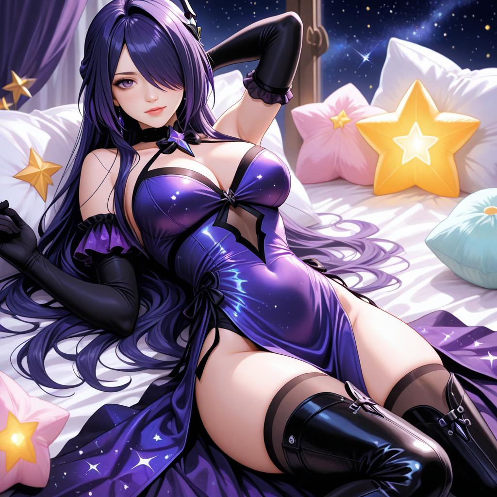 A digital anime-style illustration of a girl with long purple hair lying on a bed. She wears a shiny purple and black outfit with thigh-high black boots and long black gloves. The bed has purple and yellow star-themed pillows in the background.