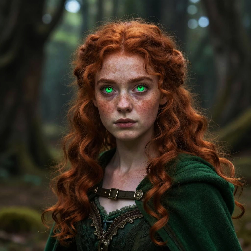 Red hair green eyes freckles fantasy character with flowing curly red locks, bright green eyes sparkling with mischief, gentle freckles on her cheeks, wearing an emerald cloak, standing in a magical forest, mystical and enchanting mood, ultra-realistic style.