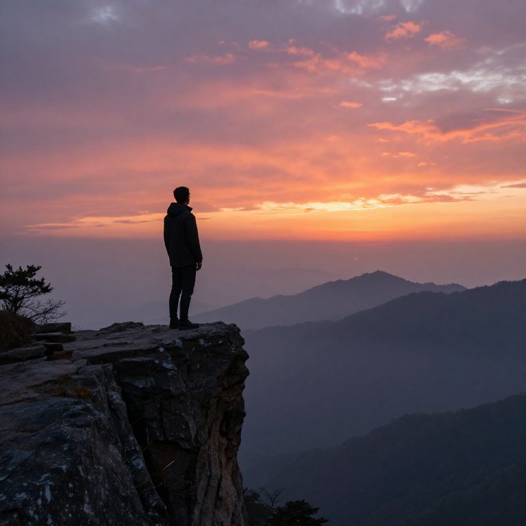Stsnding tall on a cliff edge, a lone figure watches a breathtaking sunrise over misty mountains, vibrant colors illuminating the sky, detailed silhouette, atmospheric perspective, cinematic lighting, ultra-realistic style.