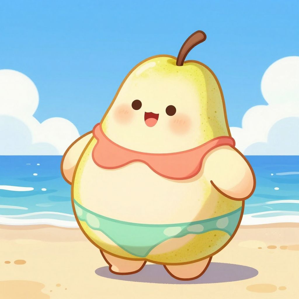 Chubby pear body shape character enjoying a sunny day at the beach, colorful swimsuit, playful expression, bright blue sky and ocean waves, stylized and cheerful