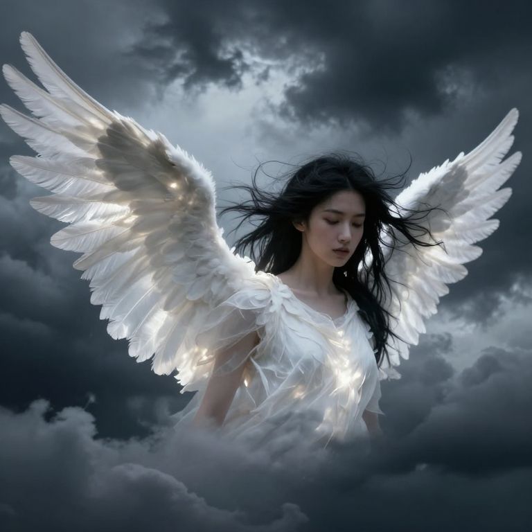 An ethereal angel, cloaked in serenity and sorrow, cradles a luminous jar of bottled starlight, weaving a poignant narrative of lost memories and celestial whispers, where the weight of forgotten civilizations lingers in the air like a soft, melancholic hum.