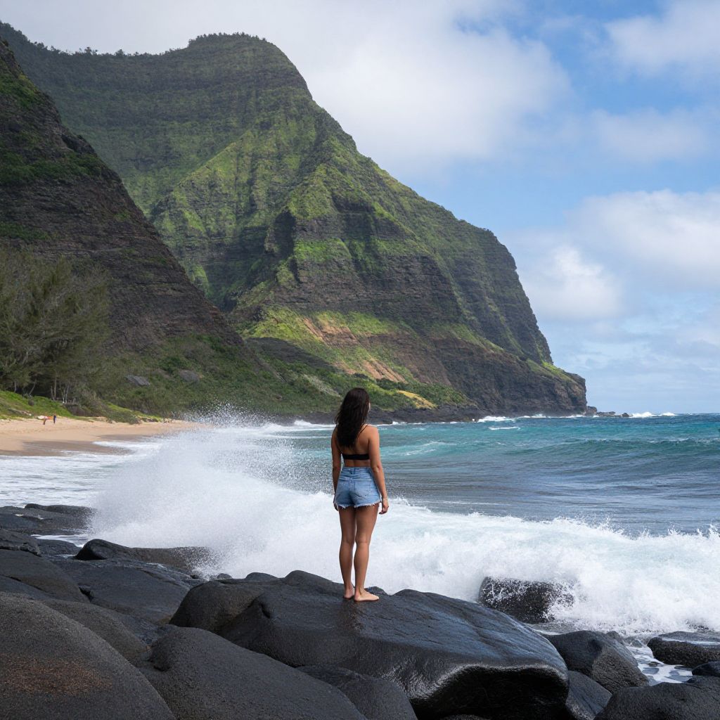Photograph of a young woman with long brown hair standing on dark volcanic rocks, facing a tropical beach. She wears a white tank top and blue denim shorts, standing barefoot. The ocean waves crash against the shore, with white foam visible. A lush, green mountain rises in the background, surrounded by dense forest. The sky is partly cloudy with patches of blue. The beach has light sand, and small trees are visible on the left. The overall scene is vibrant and serene, highlighting the natural beauty of the coastal landscape.