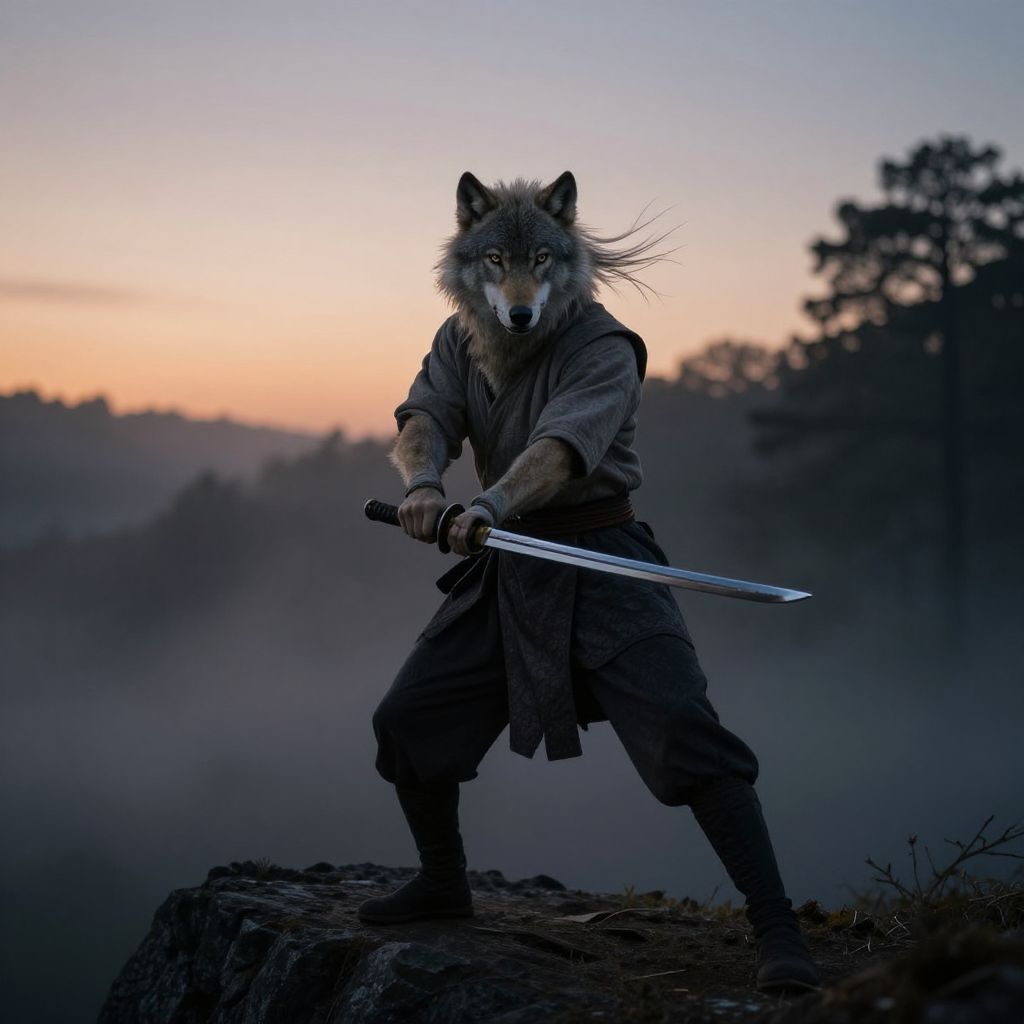 Photograph of a wolf standing in a snowy, narrow alley between wooden buildings. The wolf, with a mix of gray, black, and white fur, wears a gray, belted, medieval-style cloak and black gloves, holding a silver sword in its right paw. Warm, glowing lanterns hang on either side of the snow-covered path. Snowflakes gently fall, and the blurred background suggests a snowy, wintry evening. The wolf's piercing eyes are focused forward, creating a striking, almost anthropomorphic presence. The overall scene is serene yet mysterious.