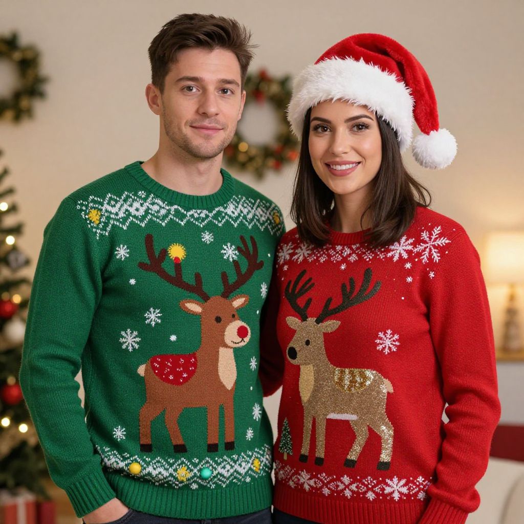 Two individuals stand together, donning festive Christmas sweaters—one green with a red reindeer and colorful ornaments, the other red with a glittery reindeer and snowflake patterns—while the woman wears a red Santa hat with a fluffy white pom-pom, all set against a warmly lit indoor backdrop featuring holiday decorations and soft lighting.
