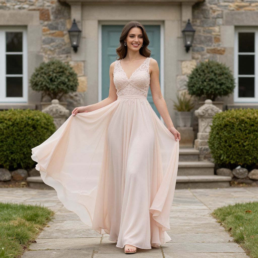 Photograph of a smiling, fair-skinned woman with dark brown, wavy hair wearing a floor-length, pale pink, sleeveless wedding gown with a deep V-neck and intricate lace bodice. She holds the skirt of her dress out to the sides, revealing its flowing, chiffon texture. She stands on a stone pathway in front of a stone house with two symmetrical windows, black lanterns, and green shrubs on either side of the steps. The background includes a light blue door and the house's textured stone facade. The scene is outdoors in daylight.