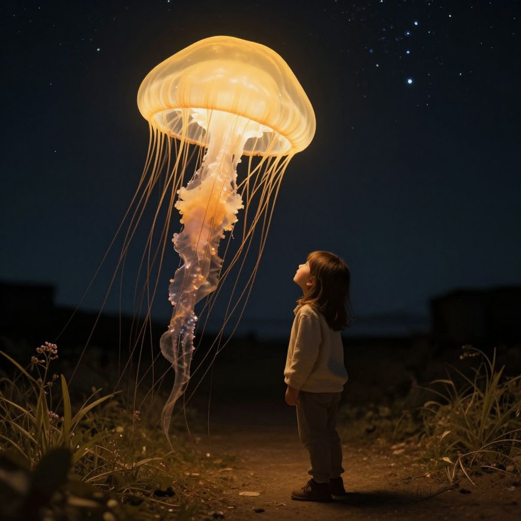 In a realm where wonder and mystery intertwine, a child stands in awe beneath a luminous jellyfish, its ethereal glow casting a golden warmth over the night, symbolizing the boundless curiosity and hope that illuminate the path of innocence amidst the vast, starlit expanse.
