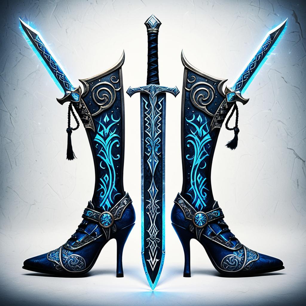 Illustration of ornate fantasy swords designed with a mythical theme. The heels are depicted in glowing runic inscriptions, shimmering blue blades, emphasizing their dramatic and stylish impact in a high-quality, eye-catching design.