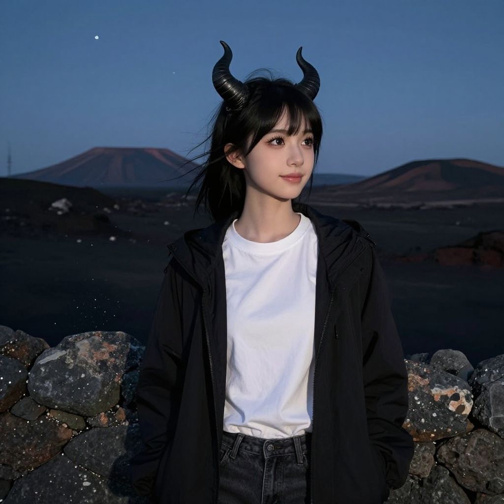 Photograph of an Asian woman with fair skin and black hair, wearing black faux horns, a white t-shirt, and a black jacket. She stands in front of a dark stone wall with a desolate, mountainous landscape under a clear, deep blue evening sky. Her expression is neutral, and she gazes slightly to the right. The stone wall has a rough texture, and the distant mountains are shadowed, adding depth to the background. The lighting emphasizes her face and the horns, creating a contrast with the dark surroundings.