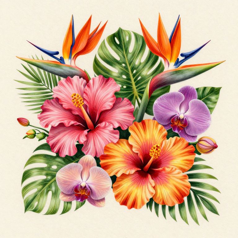 Flowersdrawings showing exotic tropical flowers such as hibiscus, orchids, and bird-of-paradise in vivid colors with detailed pencil shading and textured backgrounds, combining realism and stylized graphic elements for a lively artistic composition.