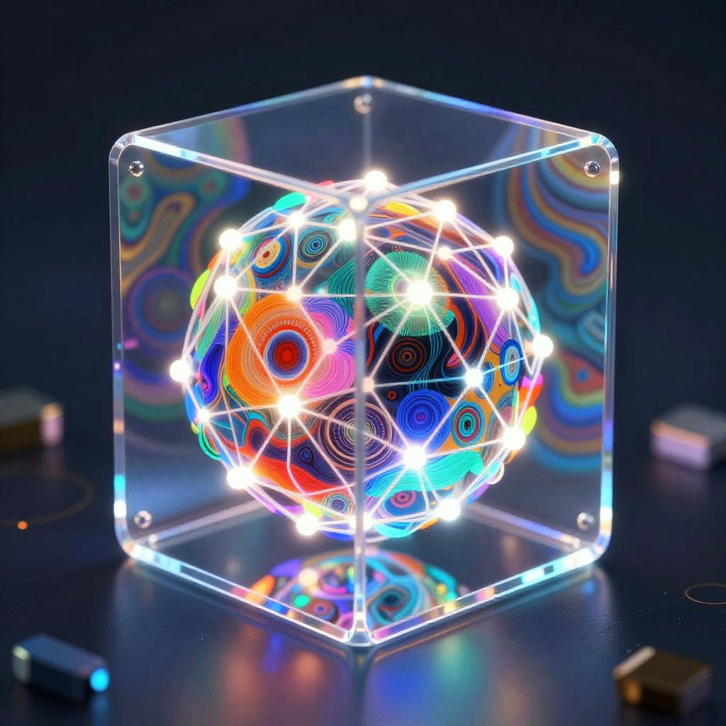 An AI that can draw anything, visualized as a sleek, glowing neural network inside a transparent cube, generating diverse art styles from abstract to hyper-realistic, with bright colors and detailed patterns cascading around it in a sci-fi atmosphere.