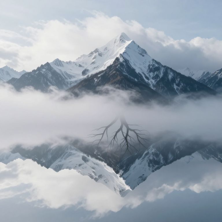 Suspended above a sea of clouds, a majestic mountain range rises with its peak shrouded in snow, while its mirrored reflection descends into the ethereal mist, roots extending downward as if grasping unseen depths.