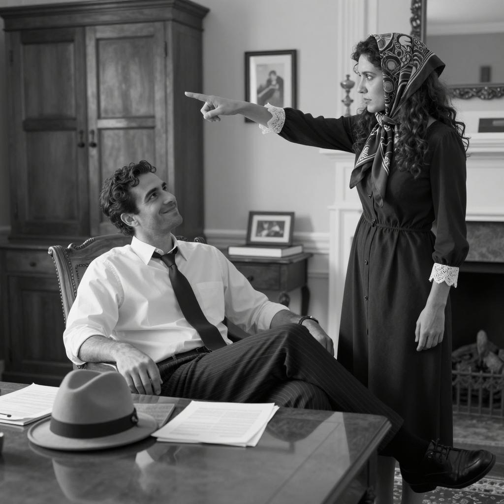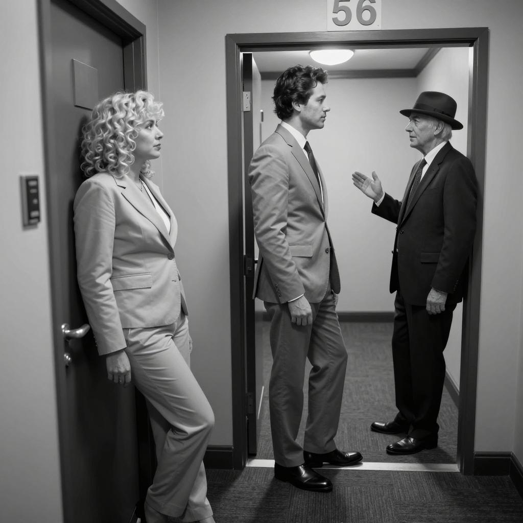 Black and white photograph. Three people in a hallway. Woman with curly blonde hair, light-colored suit, leaning against door on left. Man with dark hair, light suit, standing in doorway, facing right. Older man with hat, dark suit, gesturing with right hand, standing in background. Door number "56" visible. Carpeted floor, dim lighting.