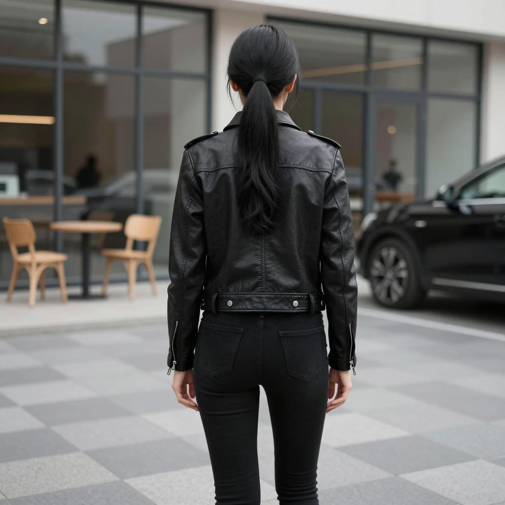 Photograph of a woman with long blonde hair standing with her back to the camera. She wears a black leather jacket, black mini skirt, and black knee-high boots with high heels. She has a black shoulder bag with a gold chain strap. She stands in front of a large gray tiled wall. The ground is paved, and the sky is blue with white clouds.