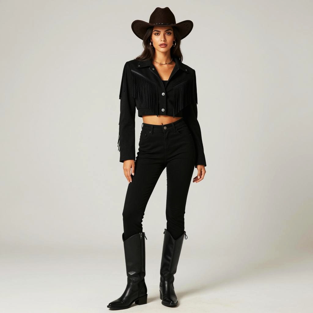 A woman dressed in a stylish black cowgirl costume poses confidently against a neutral background. Her outfit features a cropped jacket with fringe details, high-waisted pants, knee-high boots, and a dark wide-brimmed hat, embodying a modern Western cosplay style.